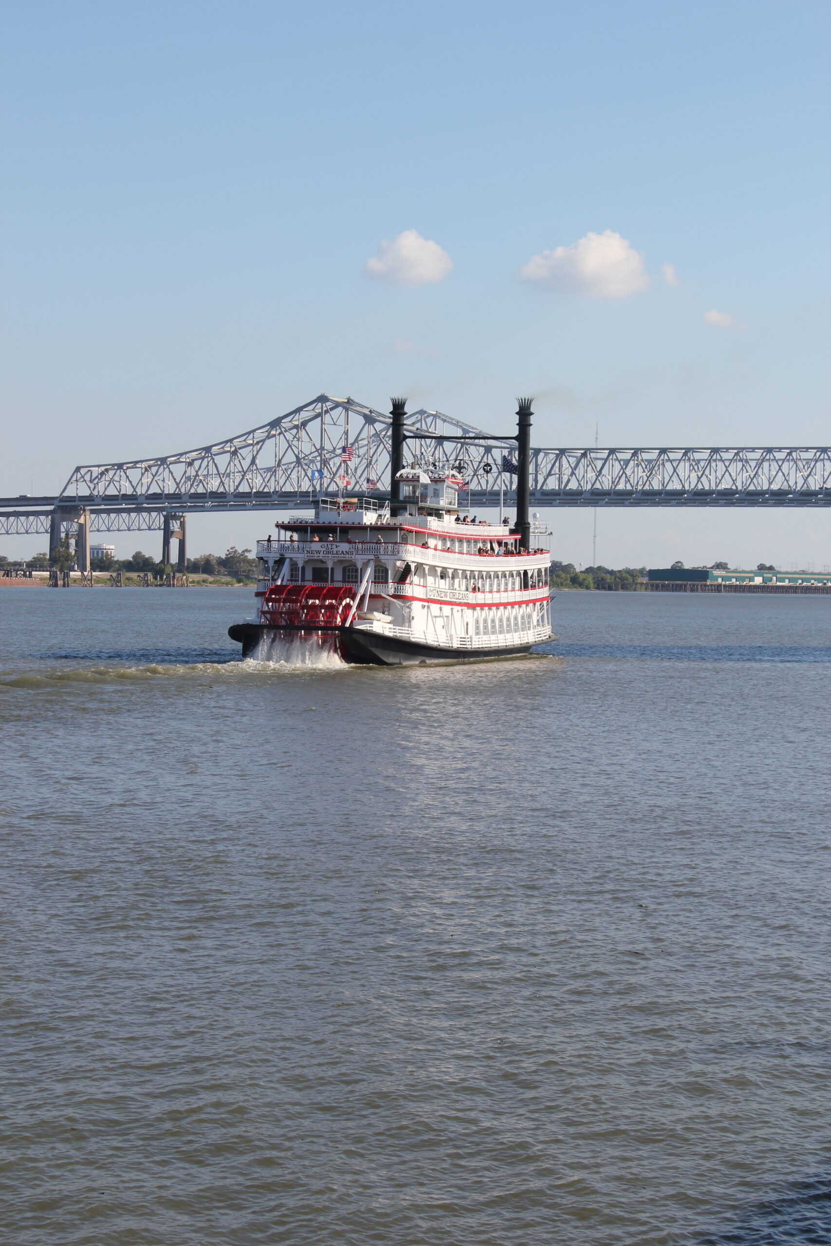 Twin bridges stretch From Mandeville to the horizon, straight as a string for 24 miles, the longest span over water in the world. The bridge is so straight I took a nap while driving toward the Big Easy for more big food.