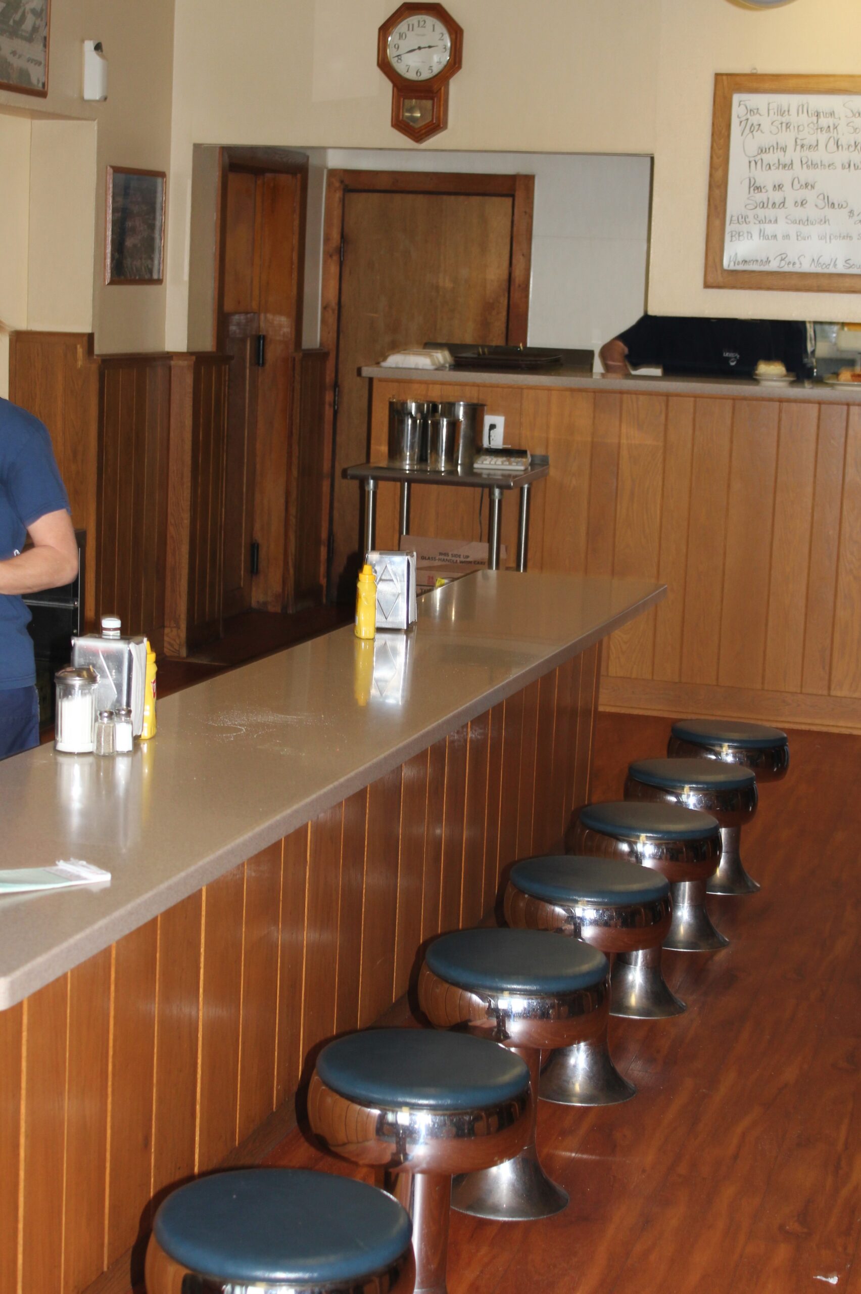 And I was right about the home cooking. The onion rings are homemade. The coconut cream pie is homemade. The chili is homemade. The beef is home grown. I was at home on the road, a rare feeling. I counted the booths. Seven. Across from booth row, seven squatty stools stood at the low counter. The place radiated good vibes. Daniel, the server, was the owner’s son. He was enthusiastic, with no hint of preacher’s kid attitude. More important, when he said that today’s blue plate special was outstanding, I believed him.